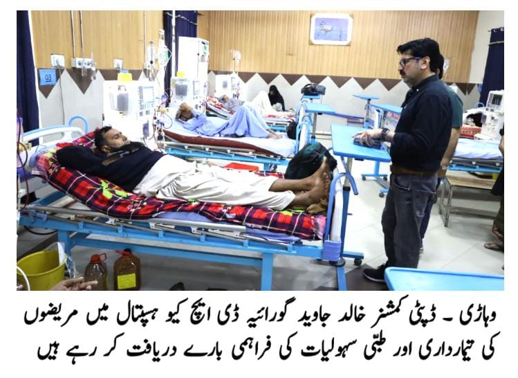 وہاڑی (عبدالغفار) ڈپٹی کمشنر وہاڑی خالد جاوید گورائیہ نے ڈی ایچ کیو ہسپتال کا تفصیلی دورہ کیا۔ انہوں نے تمام وارڈز کا معائنہ کیا اور مریضوں سے علاج و ادویات کی فراہمی بارے دریافت کیا۔ مریضوں کی جانب سے طبی سہولیات پر اطمینان کا اظہار کیا گیا۔
